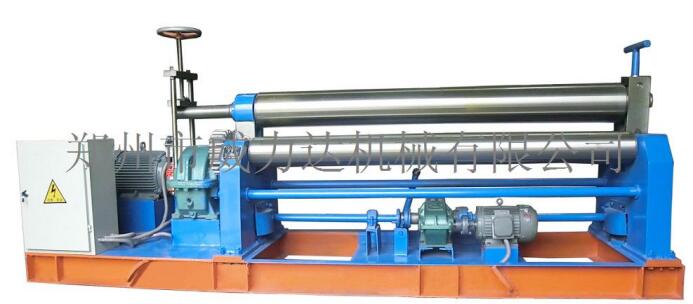 該機為對稱式三輥卷板機,兩下輥為主動固定輥,上輥通過升降絲桿、渦輪、蝸桿在兩下輥對稱中央作上下移動,兩下輥的左、右旋轉(zhuǎn)和上輥的升降移動均靠電機帶動減速器來完成,并能借助手動離合器把上輥調(diào)節(jié)成平行或傾斜位置,以適應(yīng)卷制圓形和錐形工件的需要,渦輪上下配有特種壓力軸承,轉(zhuǎn)動輕松、省電耐磨。該機集機身、傳動、電器部分為一整體,其結(jié)構(gòu)緊湊、操作方便、便于搬運、安裝和維護(hù)。